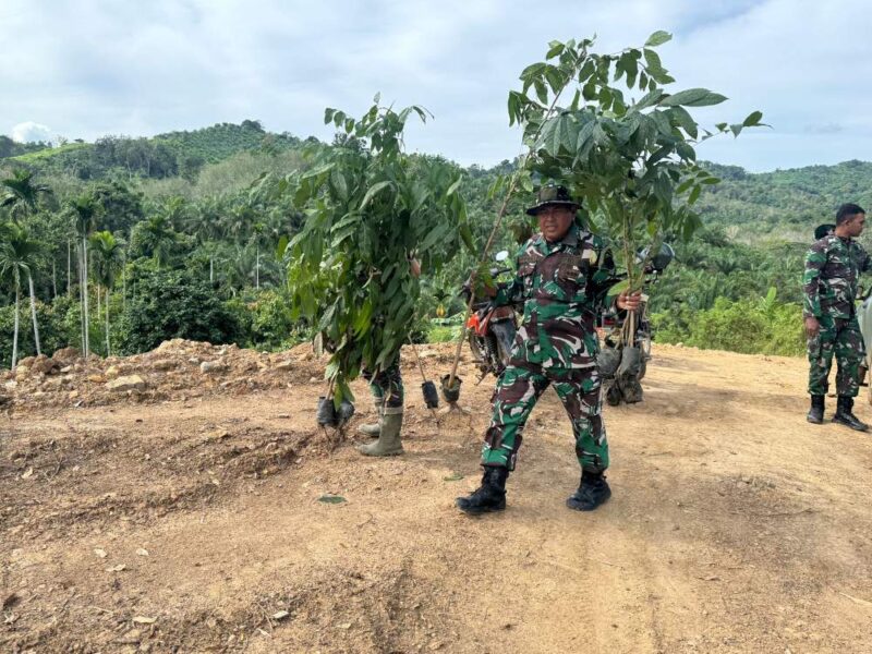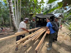 Anggota Satgas TMMD Ke-127 Kodim 0111/Bireuen melaksanakan kegiatan penurunan material rumah di Desa Jeumpa Sikureng sebagai bagian dari sasaran fisik program TNI Manunggal Membangun Desa (TMMD). Rabu (25/2/2026).