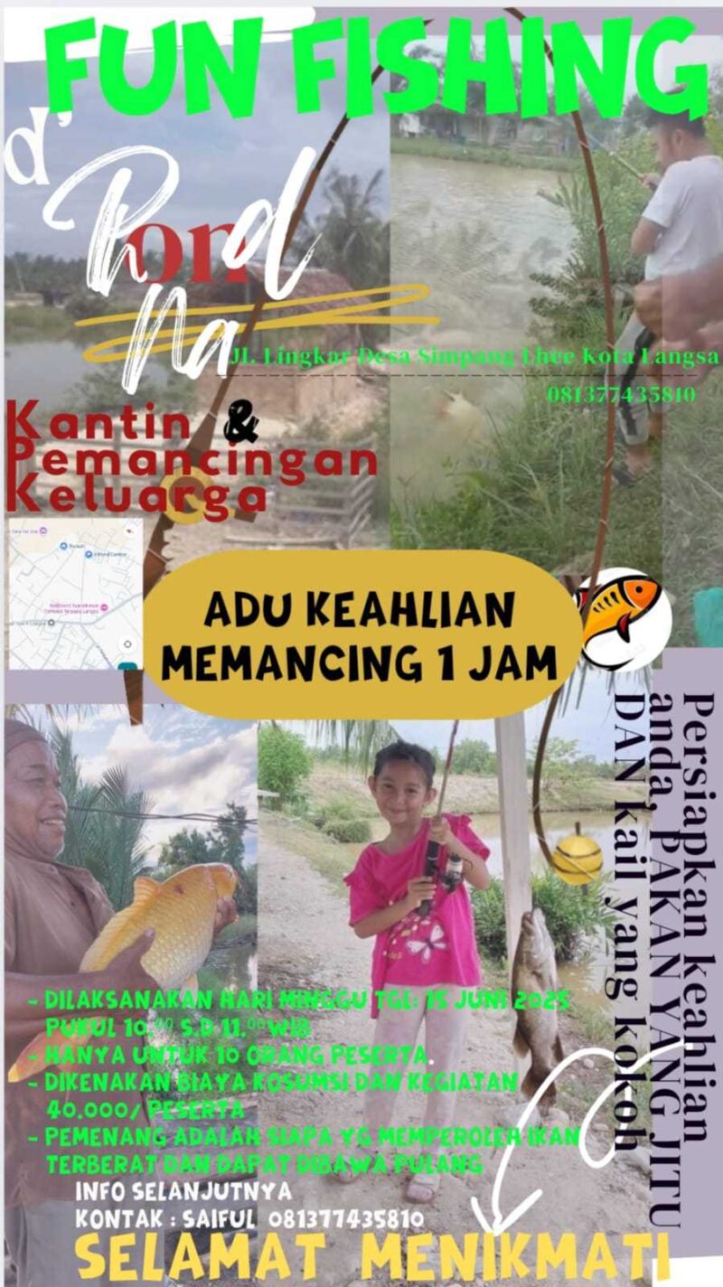 Owner Kantin dan Pemancingan Keluarga Saiful Anwar mengajak masyarakat Kota Langsa dan sekitarnya untuk mengikuti kompetisi Fun Fishing (Mancing Gembira) di Phona pada hari Minggu tanggal 15 Juni 2025 (besok) yang akan di laksanakan pada pukul 10.00 Wib s/d 11.00 Wib.