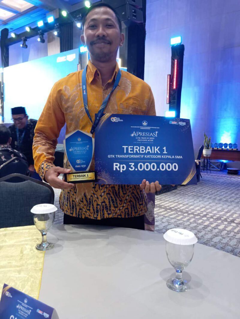 InfoLangsa.Com – Banda Aceh Kepala Sekolah SMAU CND Langsa Muhammad Rizky, S.Pd.,Gr.,C.ME.,C.LS.,C.S atau yang sering di sapa Mr. Rizky kembali menjadi Juara 1 Guru dan Tenaga Kependidikan (GTK) terbaik Tahun 2025 se Provinsi Aceh Kategori GTk transformasi kepala SMA, yang diselenggarakan di Hotel The Pade, Aceh Besar pada Selasa malam.