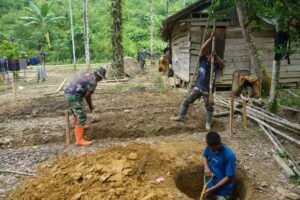 Tahap awal pembangunan ditandai dengan gotong royong Satgas TMMD bersama warga menggali pondasi rumah. Pondasi menjadi dasar utama agar bangunan RTLH nantinya kuat dan aman dihuni.