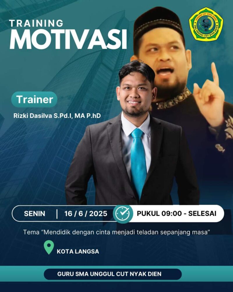 Kepala Sekolah SMA Unggul Cut Nyak Dhien (CND) Kota Langsa Muhammad Rizky, S.Pd., Gr.,C.ME.,C.LS.,C.SM dalam sambutannya mengatakan Training motivasi guru merupakan program pelatihan yang bertujuan untuk meningkatkan semangat dan kinerja guru dalam mengajar. Pelatihan ini membantu guru mengembangkan motivasi intrinsik, meningkatkan kreativitas, dan memperbarui metode pengajaran.