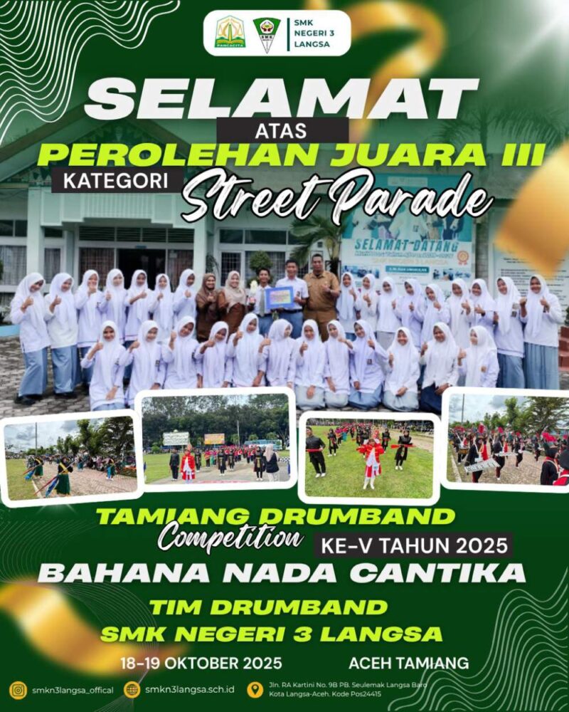 Drumband SMK Negeri 3 Langsa berhasil memperoleh juara ke 3 di kata gori Street Parade Di Ajang Drumband Competition ke V 2025 Di Aceh Tamiang yang di gelar pada Minggu 19 Oktober 2025