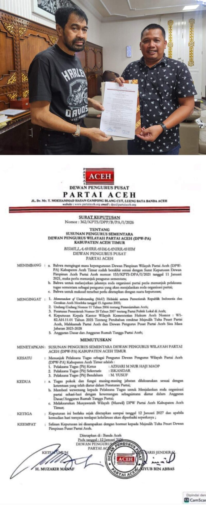 Dalam hal ini Ketua Dewan Pimpinan Pusat (DPP) Partai Aceh H.Muzakir Manaf atau yang akrab di sapa (Mualem) dalam pernyataannya menyebut bahwa Azhari M.Nur (Haji Maop) sebagai Plt.Ketua Dewan Pimpinan Wilayah (DPW) Partai Aceh (PA) Kabupaten Aceh Timur untuk masa jabatan 2026 /2027.Senin, (12/01/2026).