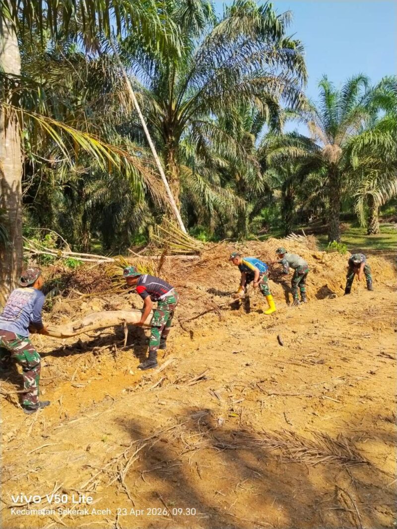 Kali ini, Satgas TMMD bersama masyarakat bergotong royong membersihkan lokasi jalan yang telah dibuka di Desa Suka Makmur Kecamatan Sekerak, Kabupaten Aceh Tamiang. Kamis (23/04/2026)