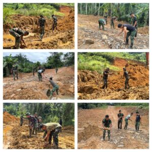 Tak ada keluhan, tak ada kata menyerah. Meski medan berat, tanah yang labil, serta genangan air yang menghambat pekerjaan, semangat pengabdian tetap menyala. Para prajurit itu bekerja dalam senyap, hanya diiringi suara batu yang saling beradu dan langkah kaki yang menapak kuat—sebuah irama sederhana dari kerja keras yang tulus.