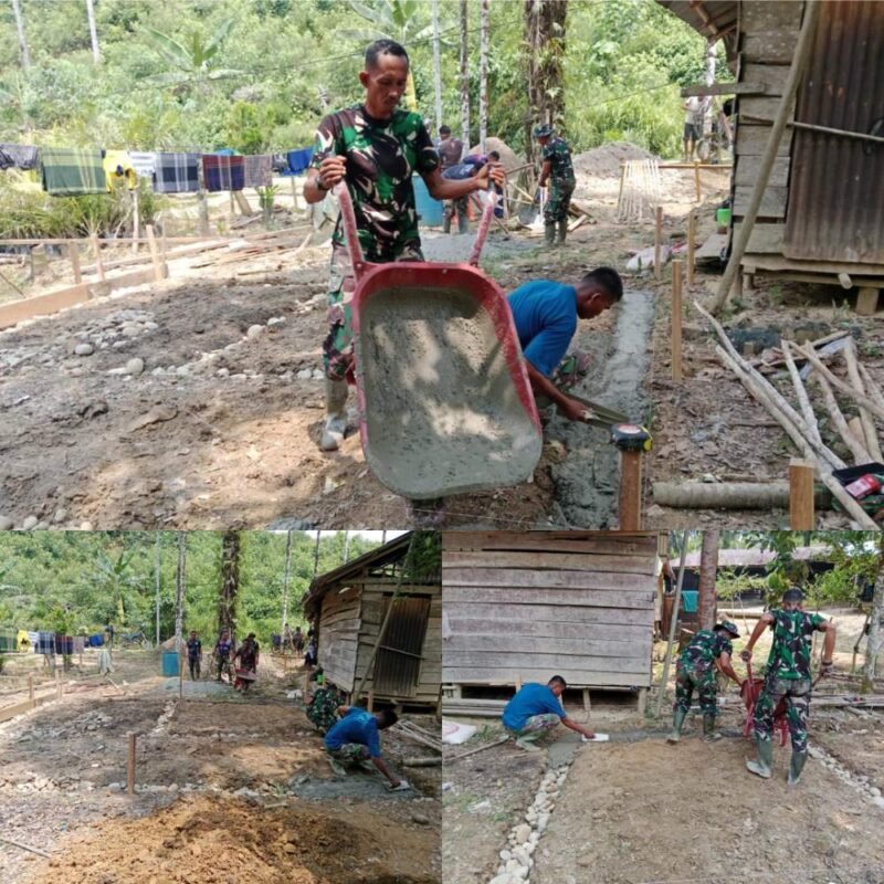 Terlihat Satgas bersama warga berjibaku mengecor dasar pondasi agar bangunan itu lebih kokoh serta hasil bangunannya bisa maksimal. Serda Arifudin Kepala tukang pembaguan RTLH mengatakan renovasi RTLH yang dikerjakan hari ini adalah pengecoran pondasi rumah.