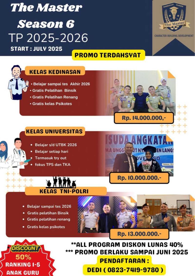 The Master Season 6 Tahun Ajaran 2025-2026 hadir untuk Mempersiapkan para siswa siswi di Program khusus seperti Kelas Kedinasan, Masuk Universitas, dan Masuk TNI-POLRI dengan promo menarik. ” All Program discount 40% dan promosi ini berlaku sampai bulan Juli Tahun 2025 “.