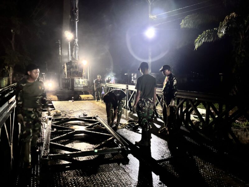 Dengan semangat pengabdian dan kerja keras, para prajurit TNI bekerja tanpa mengenal lelah. Pembangunan jembatan dilakukan secara intensif baik pada siang hari maupun malam hari agar proses penyelesaian dapat berjalan lebih cepat. Upaya ini dilakukan demi memastikan masyarakat dapat segera kembali menikmati akses transportasi yang layak dan aman.
