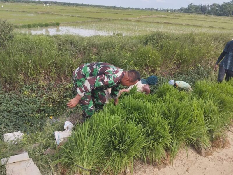 Anggota Koramil 09/Banda Mulia Serka Erwan melaksanakan pendampingan kepada petani saat mencabut benih padi yang siap tanam di Desa Matang Sepeng, Kecamatan Banda Mulia, Kabupaten Aceh Tamiang. Senin (12/05/2025)