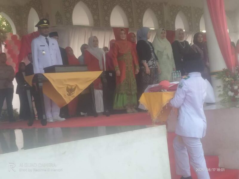 Penurunan Sang Saka Merah Putih Hari Ulang Tahun (HUT) ke-80 Republik Indonesia di Kabupaten Bireuen, berlangsung khidmat di Lapangan Ruang Terbuka Hijau (RTH), Desa Cot Gapu