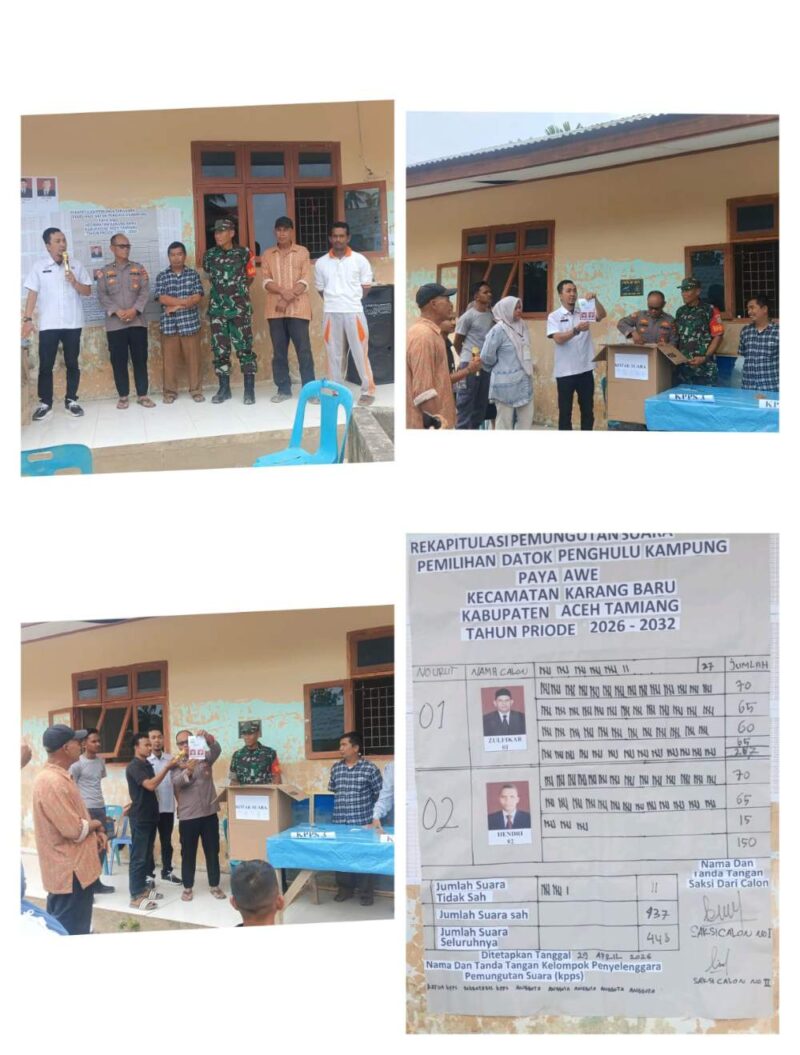 Desa Payawe, Kecamatan Karang Baru, Kabupaten Aceh Tamiang menggelar Pemilihan Datok Penghulu (Pildatok) periode 2026-2031, Rabu (29/04/2026). Pemungutan suara berlangsung tertib di TPS yang berlokasi di TPA Dusun Rotan, Desa Payawe.